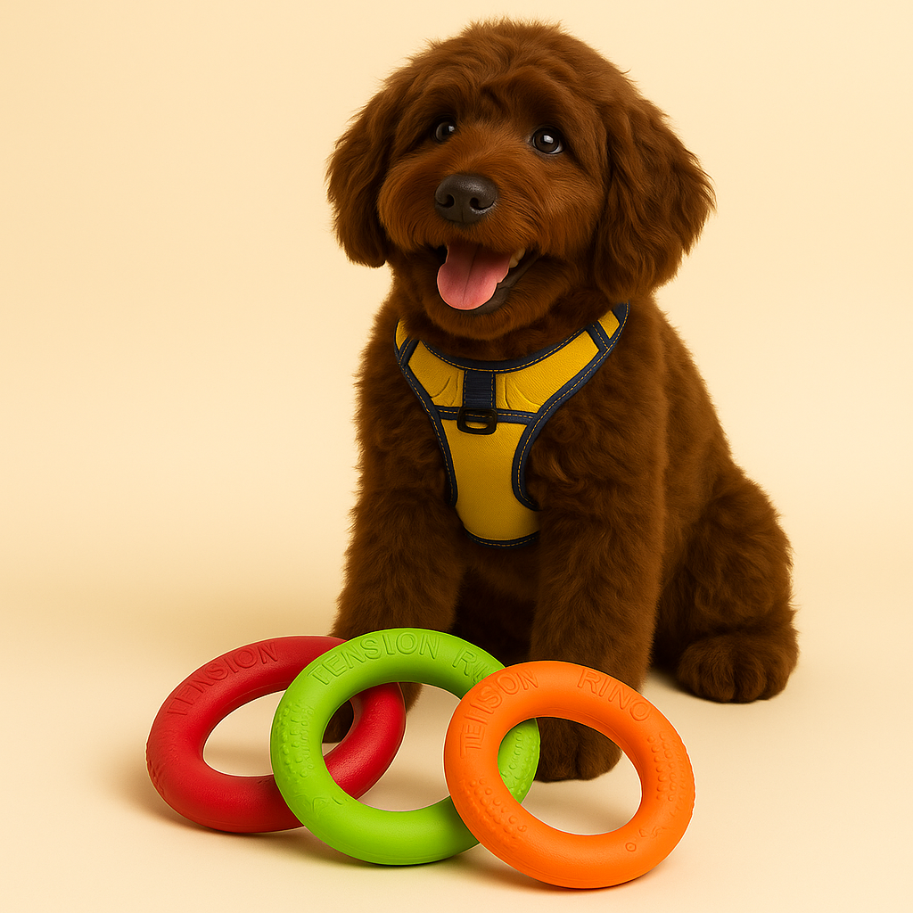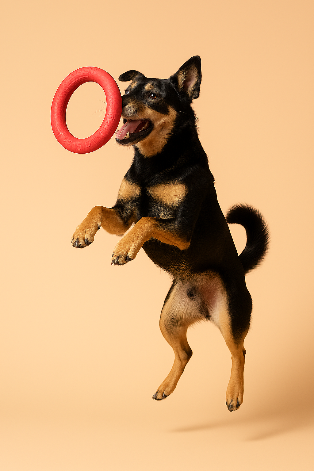 Mit seinem fröhlichen Blick auf die drei bunten Ringe zeigt Browny: Hier steckt echtes Spielvergnügen drin! Ob zum Spielen, Trainieren oder einfach zum Kauen – dein Hund wird sie lieben. 💚🧡❤